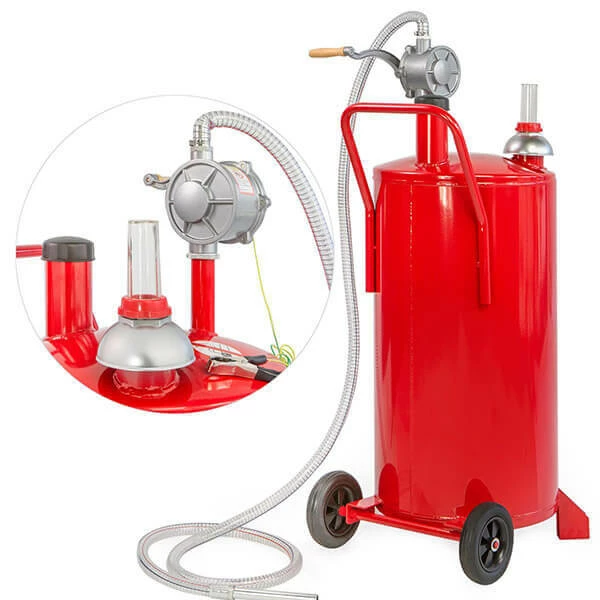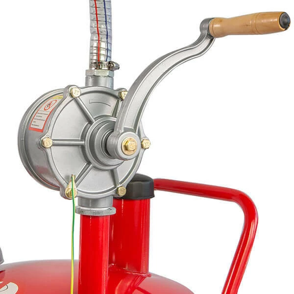 - Bi-directional pump dispenses or siphons fuel by changing the rotation of the crank handle, eliminating overfilling tanks by pulling excess fuel back into the caddy